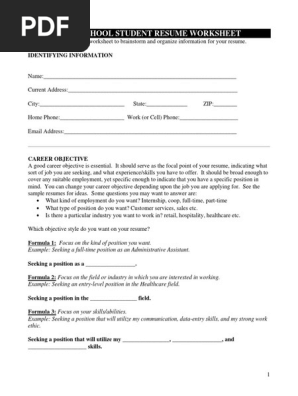High School Student Resume Worksheet Pdf Resume